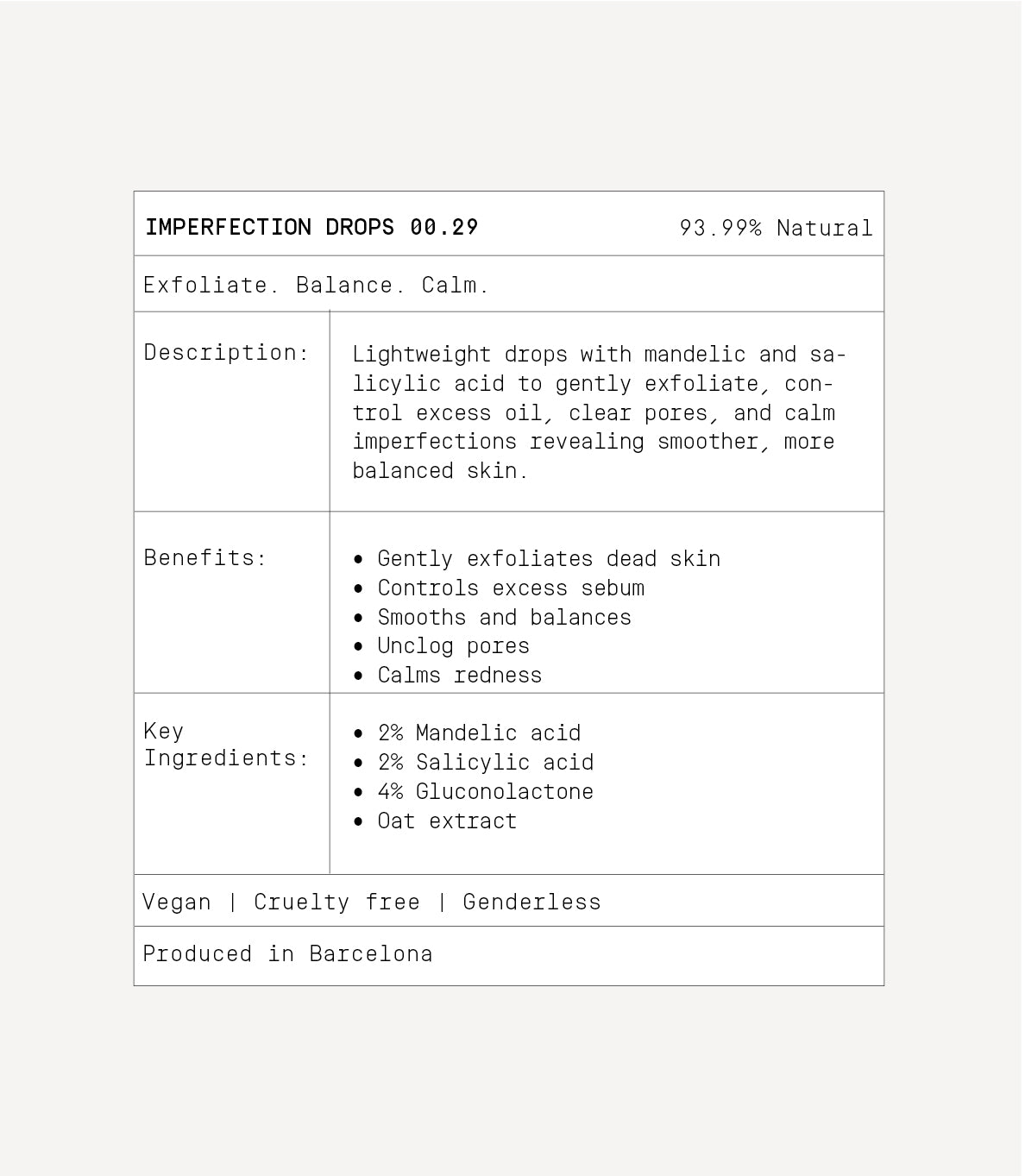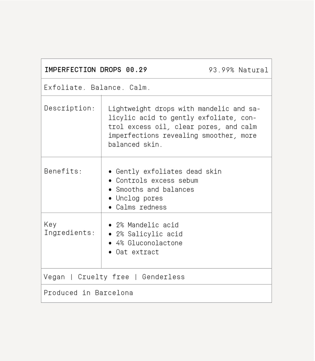 • Imperfections Drops 00.29 is a multi-active, fast-absorbing formula designed to clear pores, control excess oil, reduce breakouts, and calm redness without over-drying the skin. It combines 2% mandelic acid, 2% salicylic acid, 4% gluconolactone, and soothing oat extract for a balanced approach to blemish control.