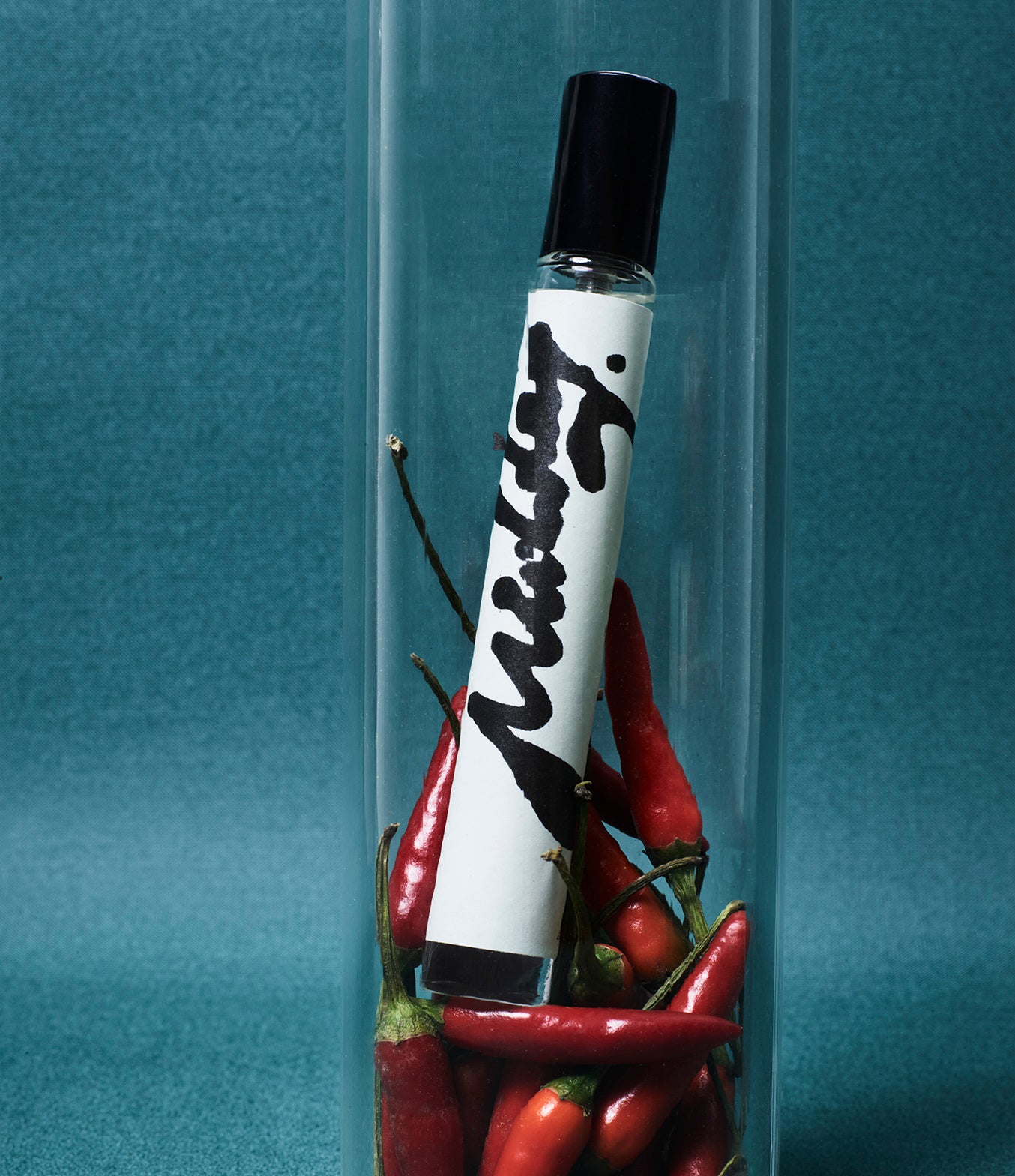An explosion of green in all its shades. The crisp efferves- cence of Calabrian bergamot sparkling over rose-minty gera- nium, the deliciously bitter aroma of tomato leaf mingled with the dusty spice of chili leaf. A touch of olive flower and mimosa unravels a soothing floral dimension that hovers sweetly over the skin, under the mellow shade of soft amber woods.