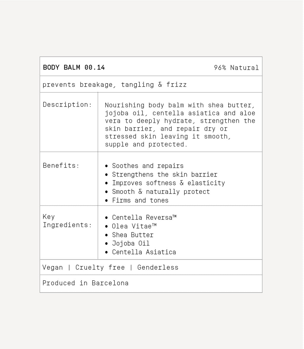• Body Balm 00.14 is a rich, deeply hydrating body cream powered by Centella Reversa™ and Olea Vitae™, two advanced biotech actives that firm, tone, and repair the skin while reducing inflammation and strengthening the skin barrier. It’s perfect for dry, stressed, or compromised skin that needs intensive care and long-lasting moisture.