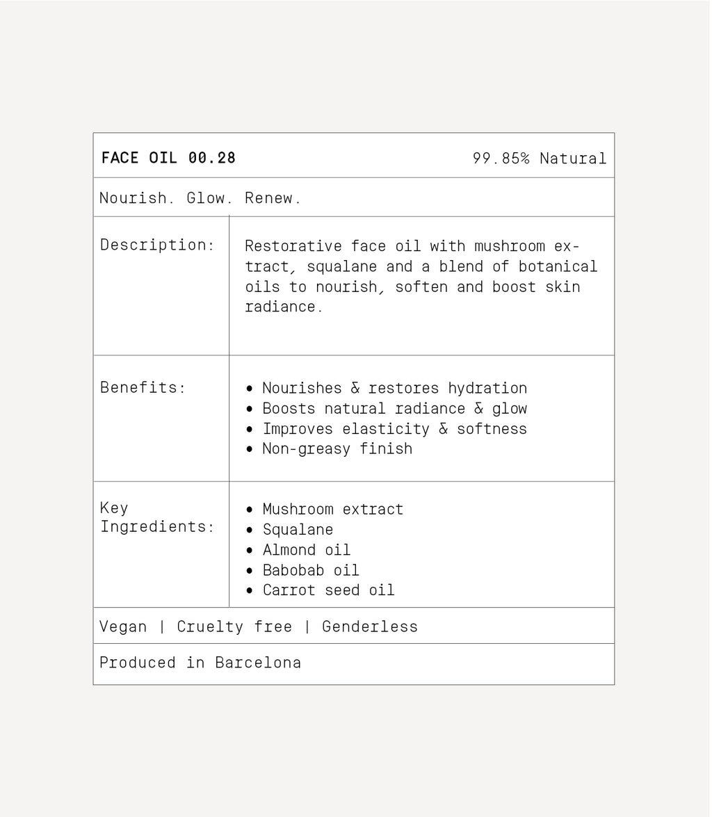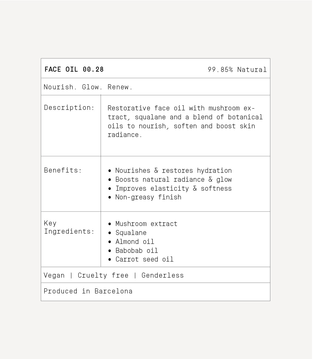 Face Oil 00.28 es un aceite facial reparador con múltiples beneficios formulado con extracto de hongos, escualeno, aceite de almendras, aceite de baobab y aceite de semillas de zanahoria. Esta potente mezcla proporciona hidratación profunda, elasticidad, protección antioxidante y un brillo radiante sin un acabado graso.