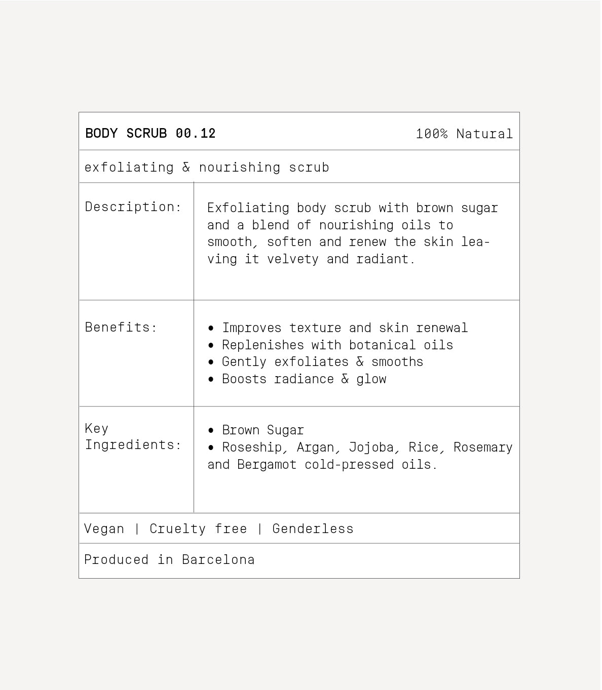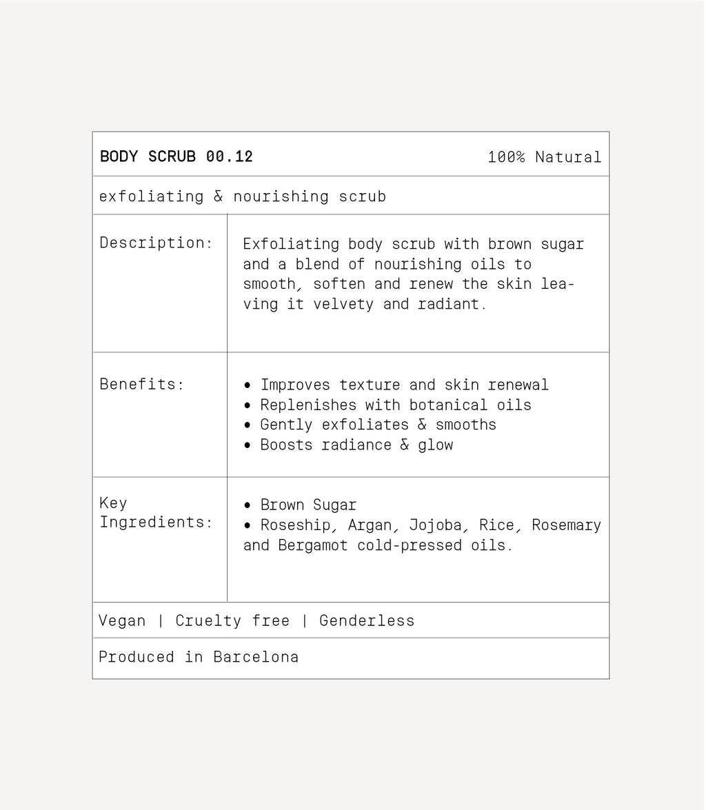 Body Scrub 00.12 es un exfoliante en gel que alisa, suaviza y renueva la piel sin eliminar su hidratación natural. Formulado con azúcar moreno, aceite de rosa mosqueta, aceite de argán, aceite de jojoba, aceite de arroz y aceite de romero, proporciona una exfoliación suave pero eficaz a la vez que nutre e hidrata la piel para un acabado radiante y pulido.