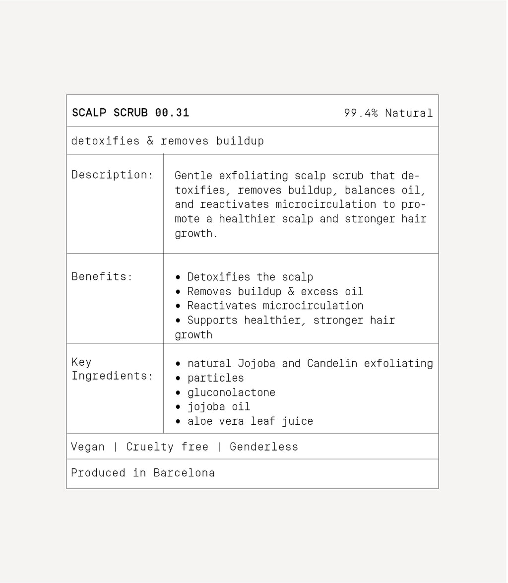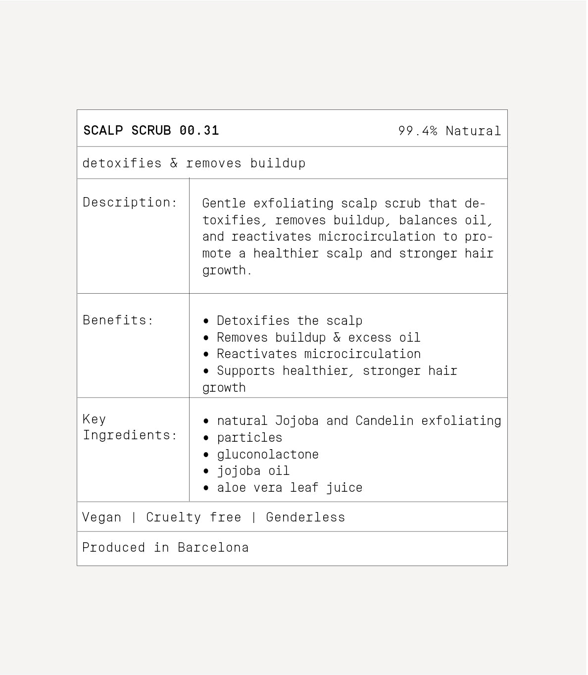 • Scalp Scrub 00.32 es un tratamiento suave de limpieza profunda formulado con partículas exfoliantes naturales de jojoba y candelilla, gluconolactona, aceite de jojoba y zumo de hojas de aloe vera. Desintoxica el cuero cabelludo, elimina las acumulaciones y el exceso de grasa, reactiva la microcirculación y favorece el crecimiento de un cabello más sano y fuerte.