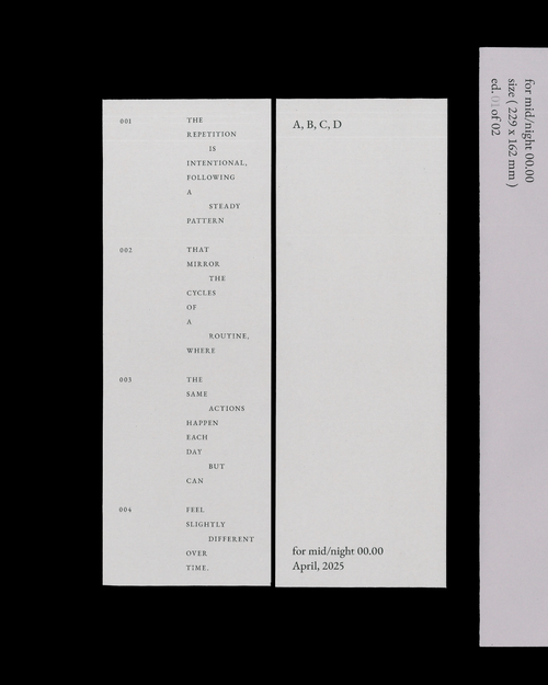 Fundado por Mid/night 00.00 en 2023, "A Routine Seenby" es un proyecto dedicado a explorar nuestros productos a través de diversas perspectivas artísticas. El objetivo de esta iniciativa es dar visibilidad a jóvenes artistas de diversas disciplinas artísticas, como la pintura, el diseño gráfico, el diseño industrial, la fotografía y las artes culinarias. A través de este proyecto, buscamos celebrar la expresión artística y destacar la intersección entre la belleza y el arte. Cada año, en marzo, para celebrar el aniversario de Mid/night 00.00, presentamos una exposición del proyecto "A Routine Seenby". Cada artista presenta su trabajo en varios formatos, ofreciendo interpretaciones únicas de nuestros productos. Mid/night 00.00 comisaria esta exposición, que reúne las diversas expresiones artísticas de todos los artistas participantes. El evento es una experiencia multisensorial que ofrece un viaje gastronómico con música, comida, cervezas y vinos naturales.