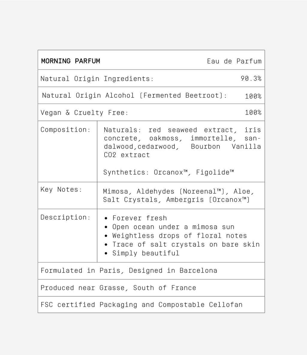 We wanted to start out with something that felt pure and energizing but in a quiet way. Leading with the sensation of openness and possibility, we looked for notes that conveyed brightness without being overly fresh in a traditional sense. The ingredients we chose radiate a sort of subtle vibrancy that blooms confidently throughout the day.